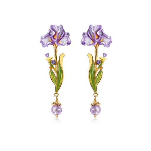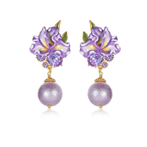 Purple Flower Irises de Luce And Gem Enamel Dangle Stud Earrings