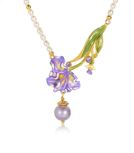 Purple Flower Irises de Luce And Gem Pearl Enamel Pendant Necklace