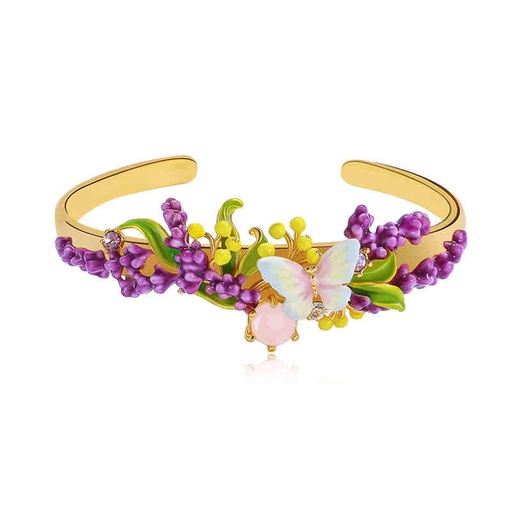 Lavender Purple Flower And Butterfly Enamel Adjustable Bangle Bracelet
