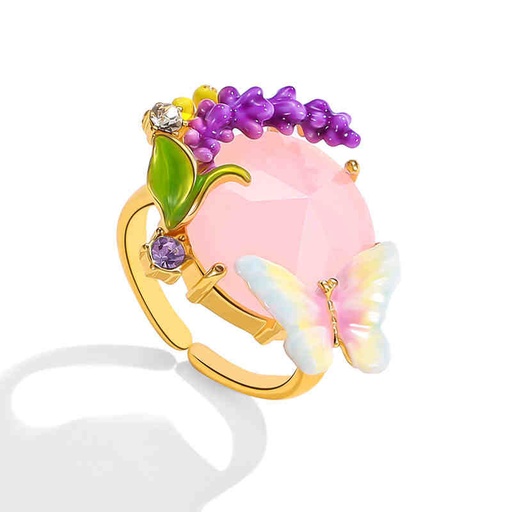 Lavender Purple Flower And Butterfly Enamel Adjustable Ring