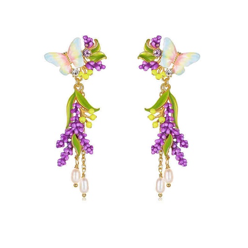 Lavender Purple Flower And Butterfly Pearl Enamel Dangle Stud Earrings