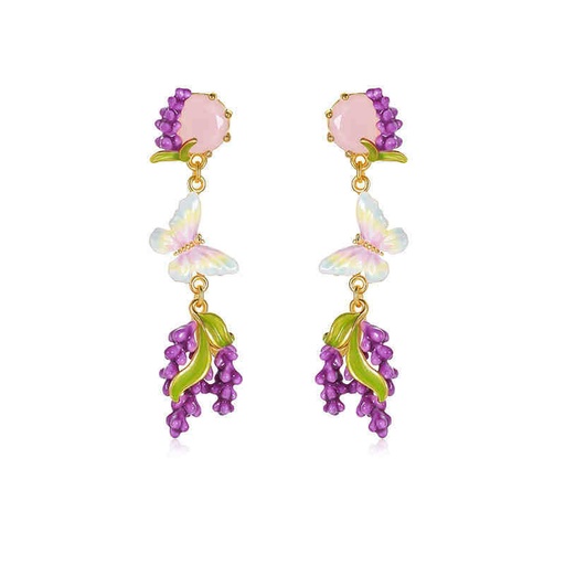 Lavender Purple Flower And Stone Butterfly Enamel Dangle Stud Earrings