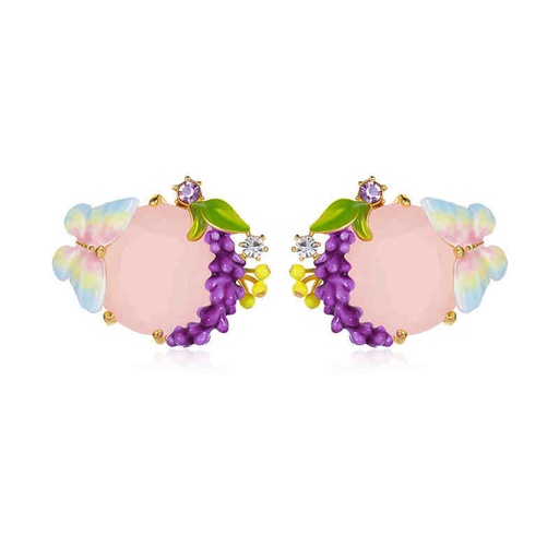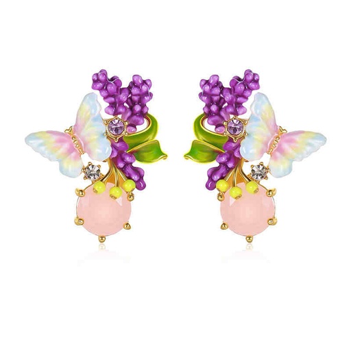 Lavender Purple Flower And Butterfly Stone Enamel Stud Earrings