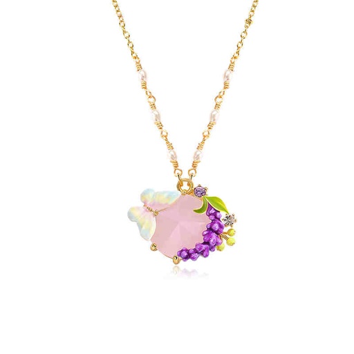 Lavender Purple Flower And Stone Pearl Butterfly Enamel Pendant Necklace
