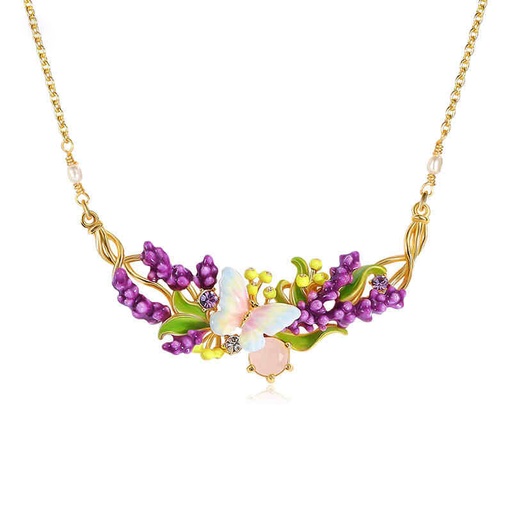 Lavender Purple Flower Branch With Butterfly Enamel Pendant Necklace