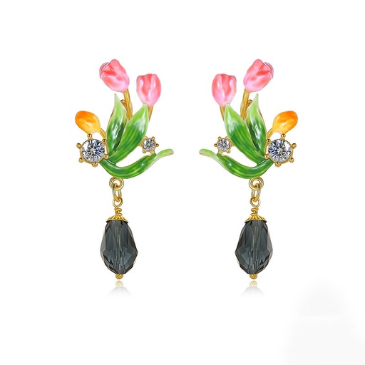 Tulip Flower Zircon Enamel Dangle Stud Earrings