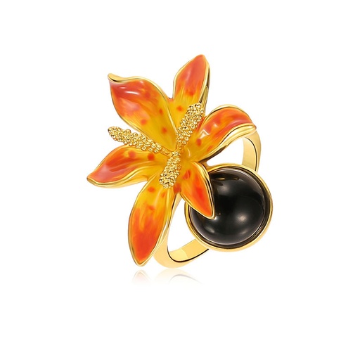 Orange Blossom Flower And Black Agate Enamel Adjustable Ring