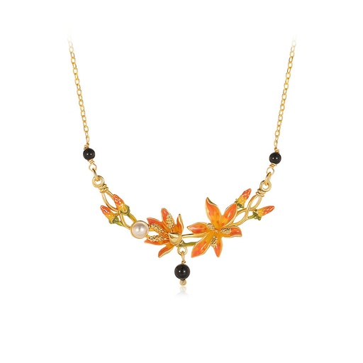 Orange Blossom Flower And Black Agate Enamel Pendant Necklace