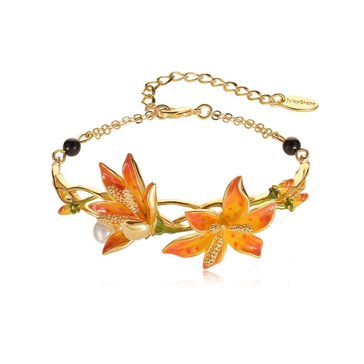 Orange Blossom Flower Branch Pearl Black Agate Enamel Bracelet