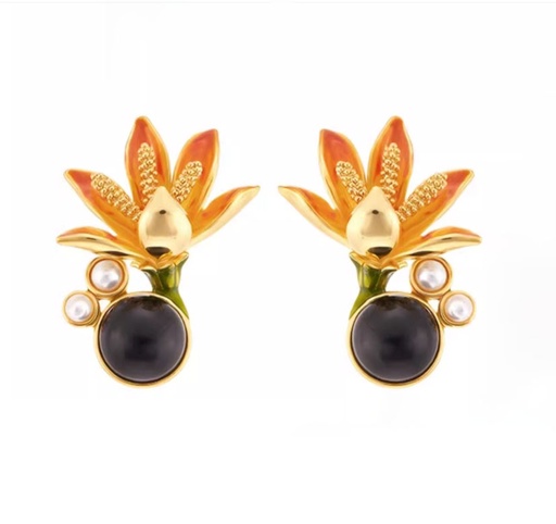 Orange Blossom Flower With Pearl Black Agate Enamel Stud Earrings
