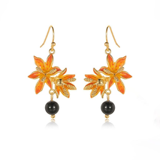 Orange Blossom Flower With Black Agate Enamel Hook Earrings