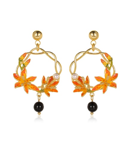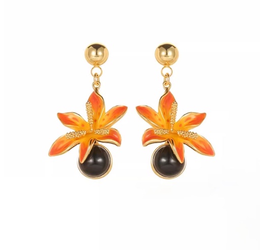 Orange Blossom Flower With Black Agate Enamel Stud Hoop Dangle Earrings
