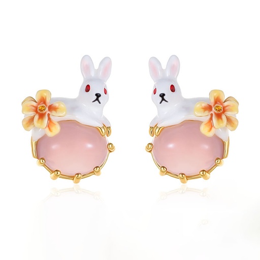 Cute Rabbit Bunny With Stone Flower Enamel Stud Earrings