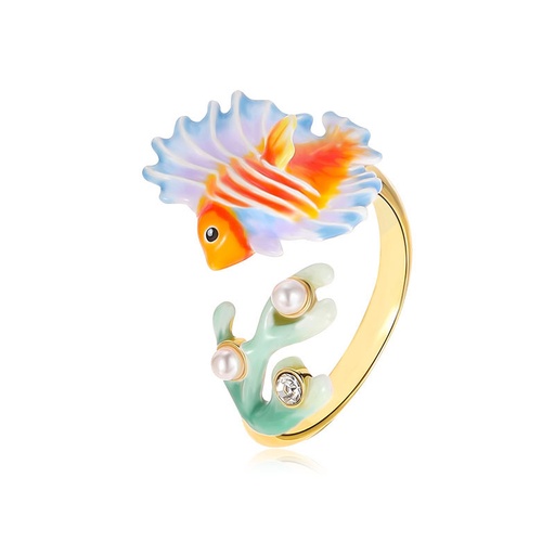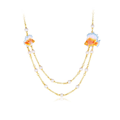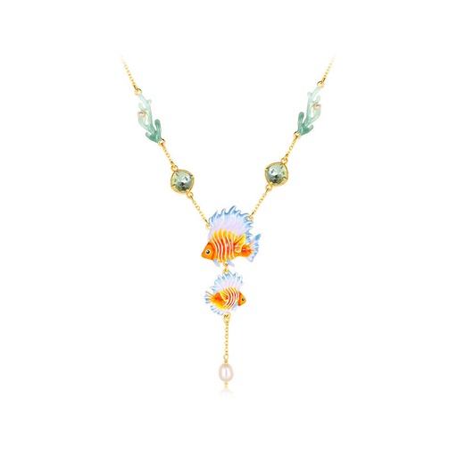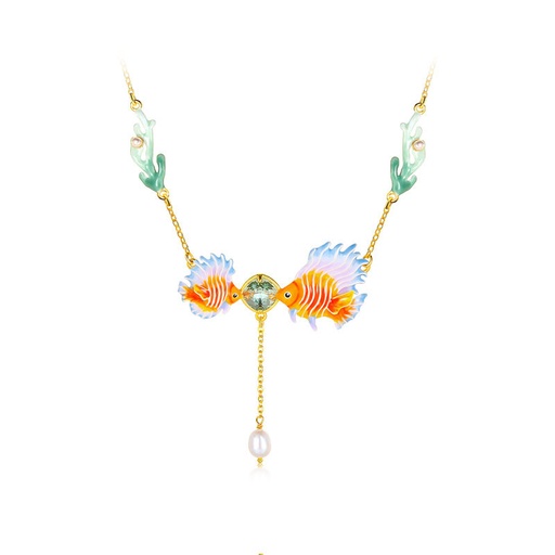 Fish Coral Zircon And Pearl Enamel Pendant Necklace