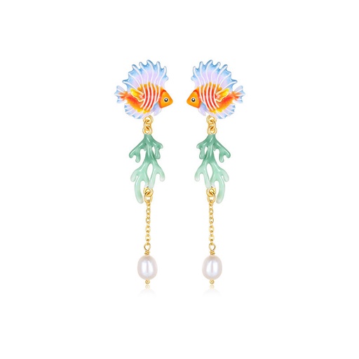 Tropical Fish Coral And Pearl Enamel Dangle Tassel Stud Earrings